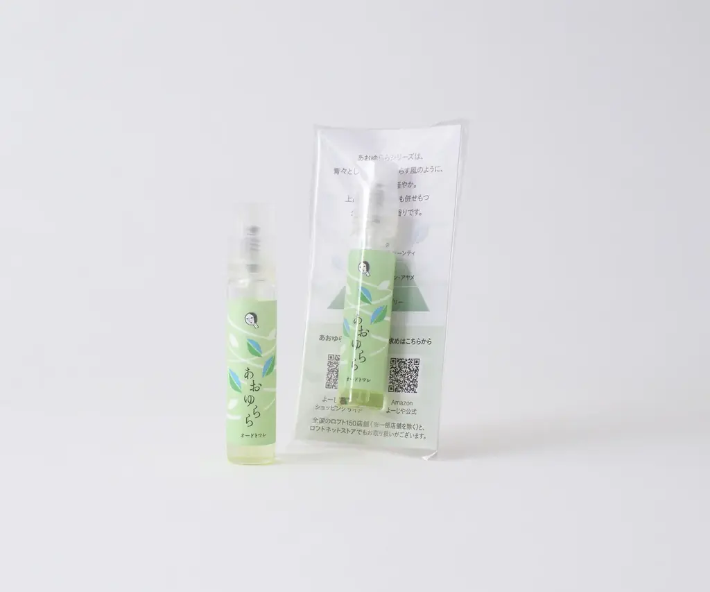 会期中、合計で2,500円(税込)以上購入した先着200名に、ミニサイズのサンプルフレグランス(2mL)を進呈します。香りはグリーンティの調和した「あおゆらら」で、すがすがしさとまろやかさが特徴です。
