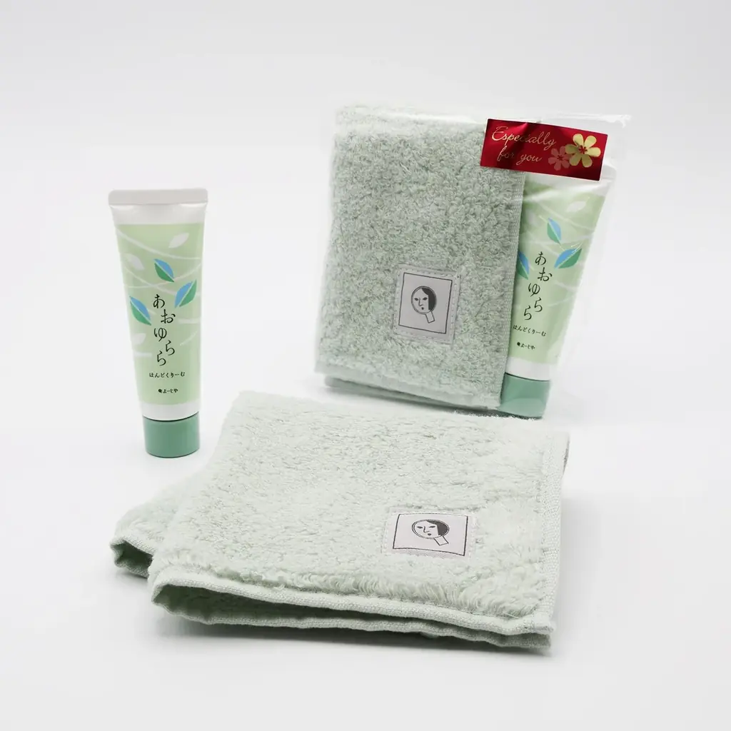 各セットのハンドクリームとタオルハンカチは、よーじやのスキンケアや雑貨の方向性を象徴するアイテムです。色と香りの組み合わせが異なるため、ギフトや春の装いのアクセントとして選べる仕様です。