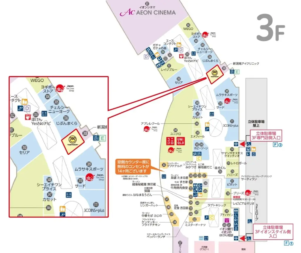 新潟亀田インター店は商業施設内に出店する常設店舗で、休日や平日のショッピングニーズに合わせて9:00から21:00まで営業します。施設の3階に位置するため、イオンモール内の導線を利用した来店が想定されます。