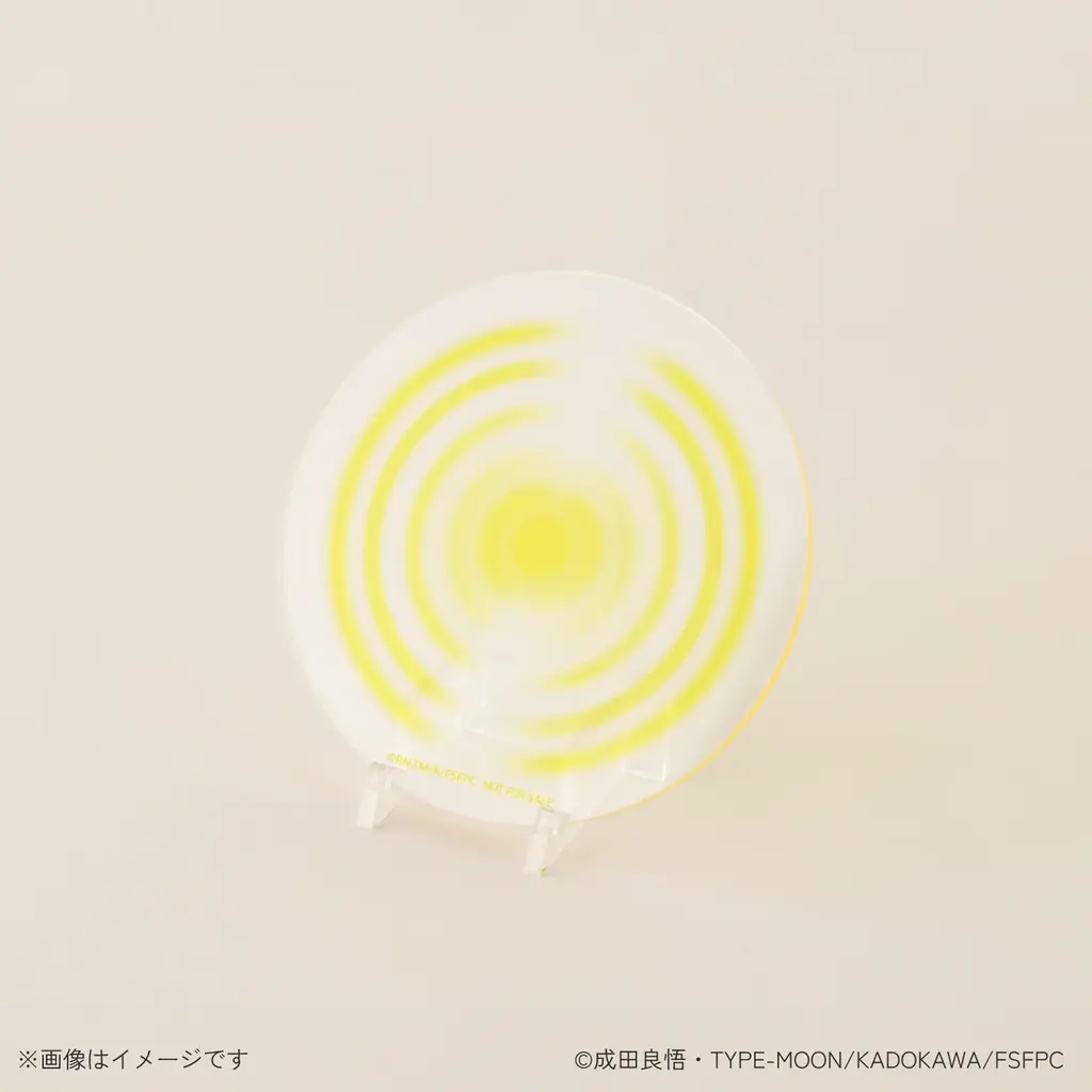 購入特典として付属するのは、アーチャーの宝具「王の財宝<ゲート・オブ・バビロン>」を描いたアクリルコースターです。コースター上にグラスを置くことで作品世界の演出を意識した見映えを楽しめる仕様で、付属のスタンドを用いればディスプレイ可能です。