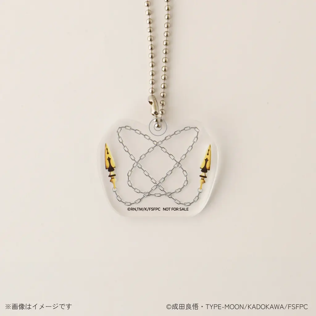 購入特典として付属するのは、ランサーの宝具「天の鎖」をデザインしたアクリルチャームです。アクリルチャームはボトルの首にかけるボトルチャームとして使用できるほか、鞄や鍵につけてキーホルダーのように運用することも想定されています。
