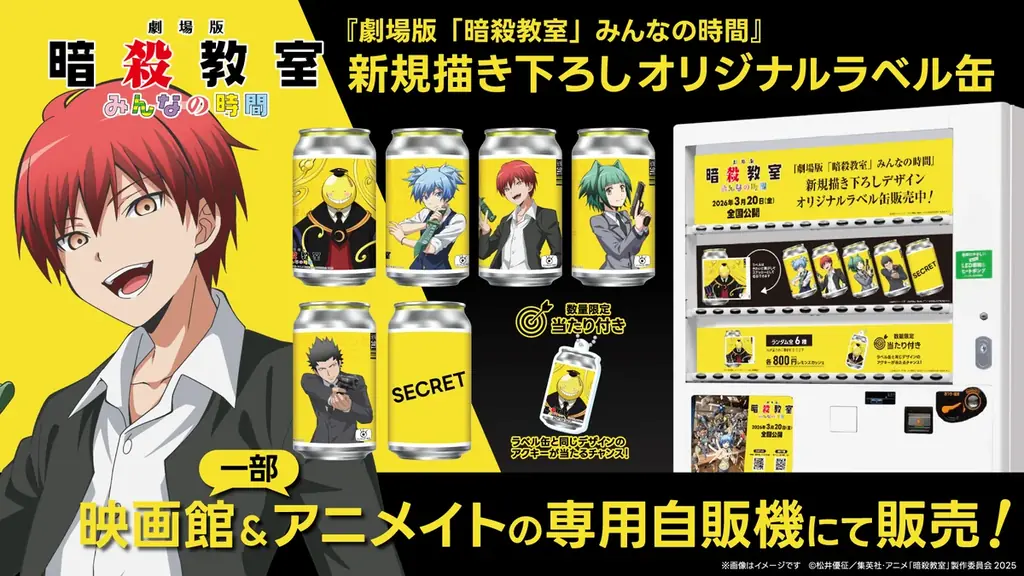 株式会社スペースファクトリーが発表したプレスリリース(配信日時:2026年3月12日 18時53分)によると、映画『劇場版「暗殺教室」みんなの時間』の公開に合わせて、新規描き下ろしのオリジナルラベル缶(TAG LIVE LABEL)が全国のサントリー自販機で販売されます。映画の公開開始日は2026年3月20日(金)で、それに先立ちオリジナルラベル缶は2026年3月19日(木)より順次販売開始となります。