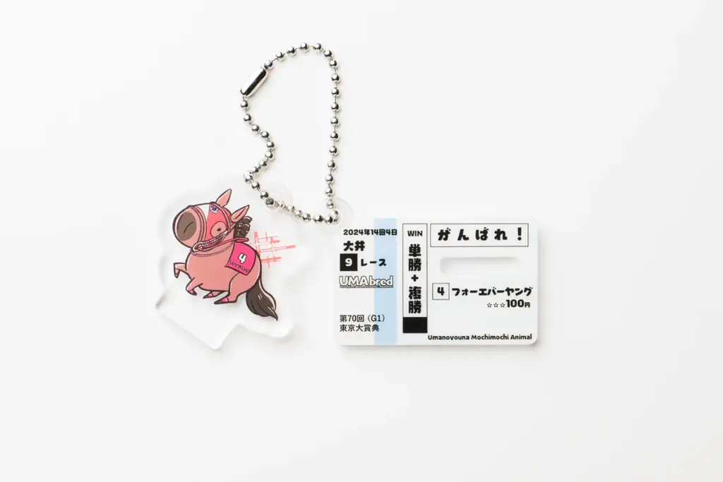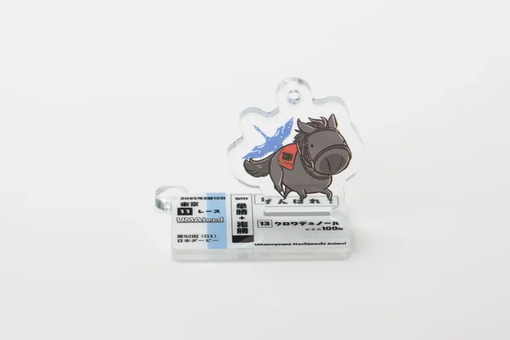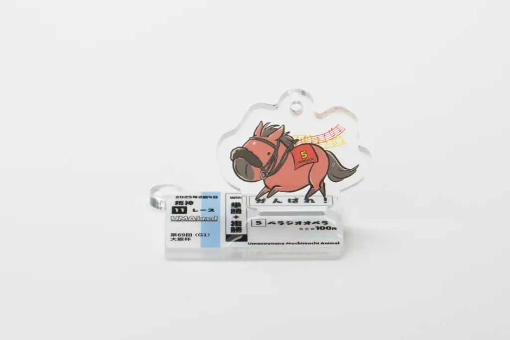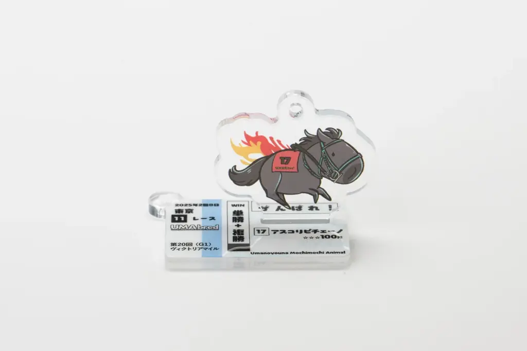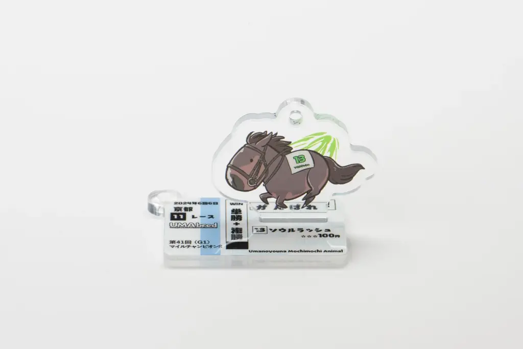 アクリル本体に加えて「馬券風デザイン」のアクリルパーツが付属します。この馬券風デザインは、該当馬が勝利したレースの「応援馬券」を再現したビジュアルで、ボールチェーンに付けてキーホルダーとして利用できるほか、台座として組み合わせることでアクリルスタンドとしても使用できます。