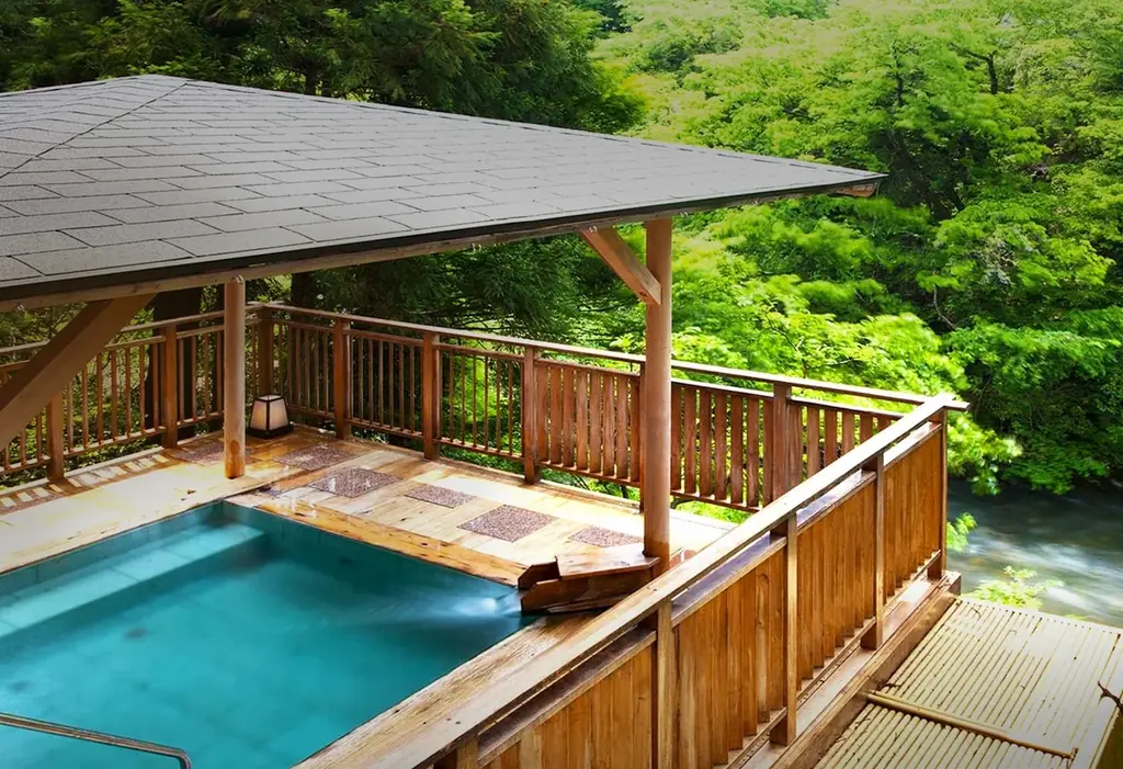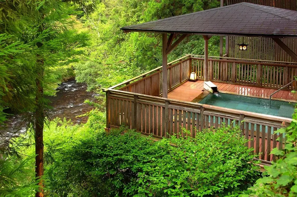 吉祥やまなかは、鶴仙渓(かくせんけい)沿いに位置する宿で、館内には九谷焼、山中塗、加賀水引など加賀の伝統工芸が配されています。ルーフトップの新設ウッドデッキは、朝の天空ヨガや夜の星空観察の舞台となり、鶴仙渓と山中温泉街を一望できるロケーションが特徴です。プログラムは宿泊者向けに無料で提供されますが、一部は要予約、定員制(先着)となっています。