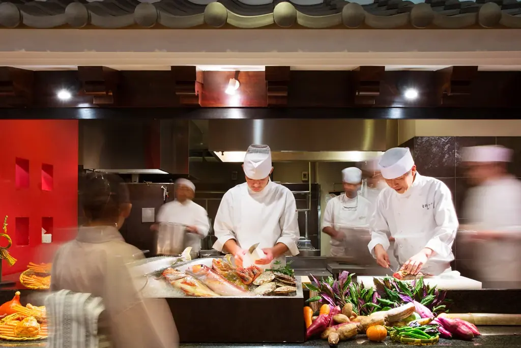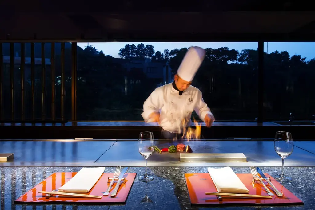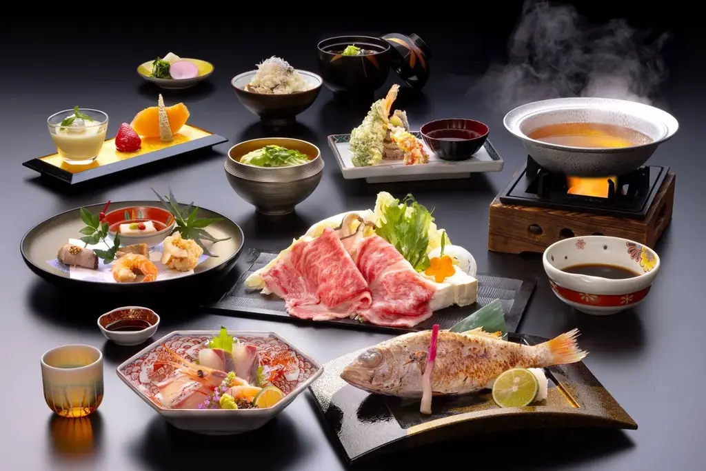 館内では加賀五彩を配した意匠、山中塗や九谷焼を用いたサービス、地元食材を用いた会席や鉄板焼が提供されます。北陸の海の幸や能登牛、加賀野菜など地域食材を中心とした料理が滞在を彩ります。