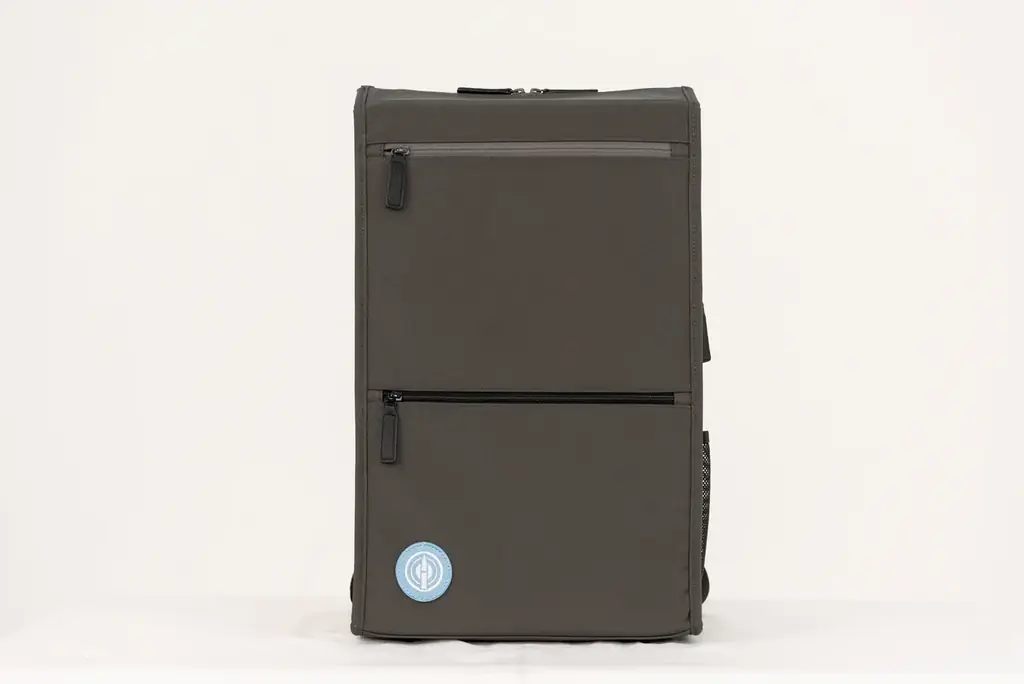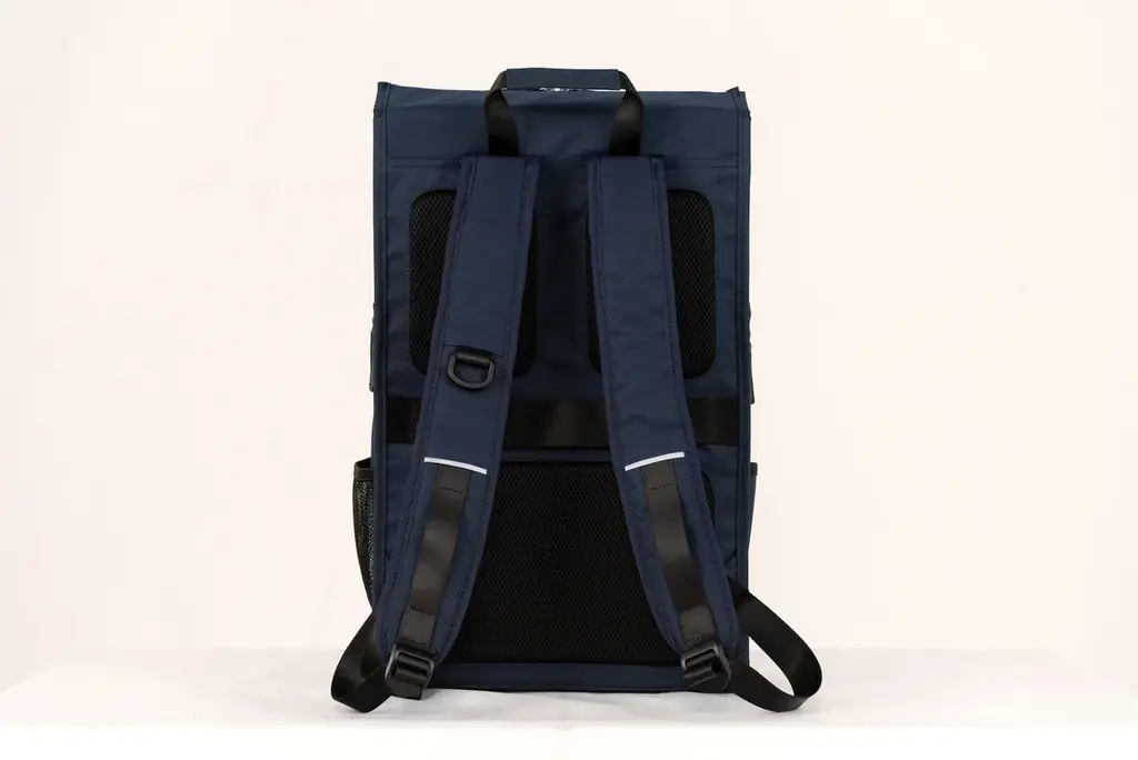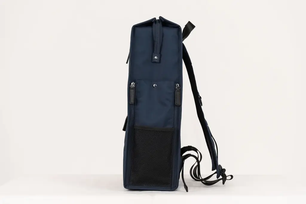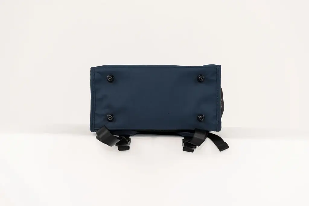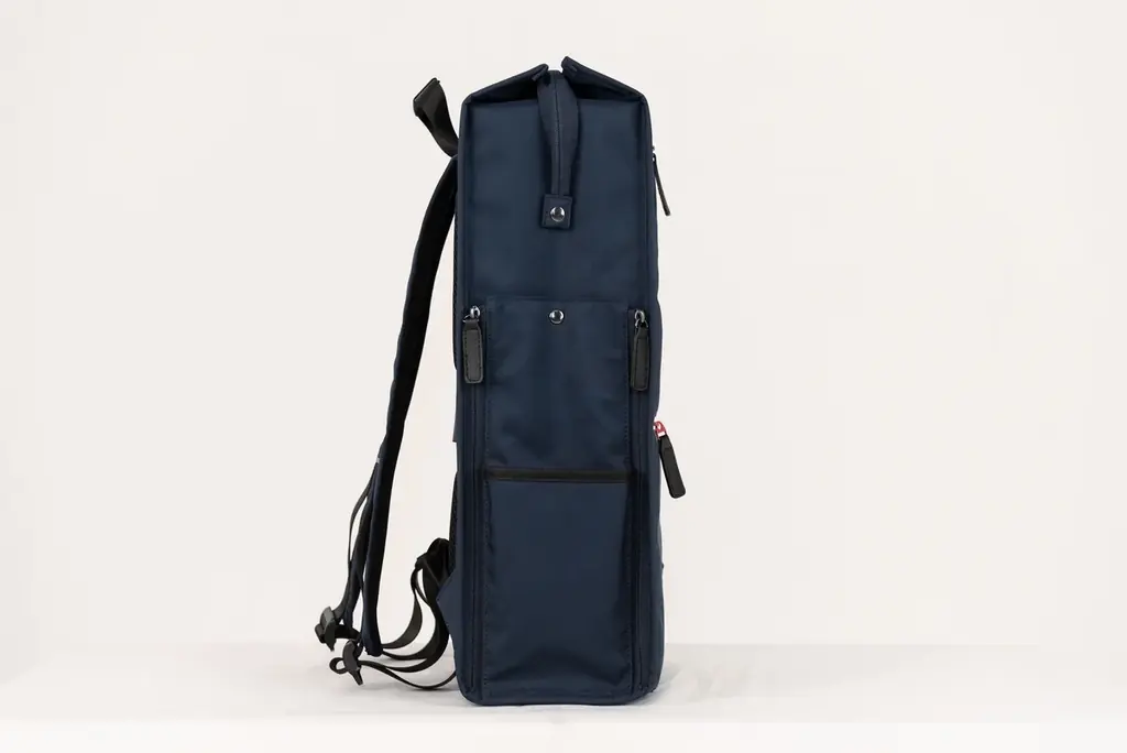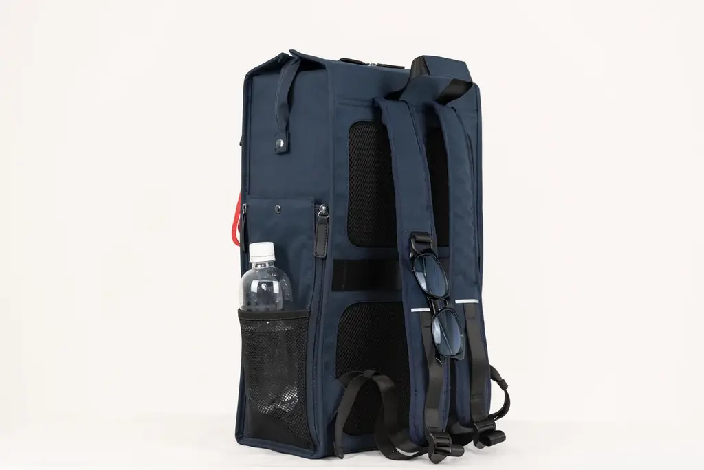 外部には、書類等を収納できるフロントのファスナーポケットが2箇所、右側面の小物収納ポケット、左側面のメッシュポケット(ペットボトルやスマホの収納想定)を備えます。背面にはスーツケース固定ベルトがあり、外出時の携行性にも配慮されています。