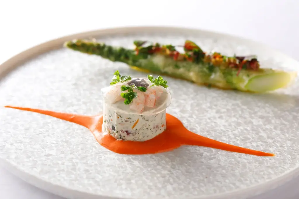 魚料理はイサキや桜鯛、車海老など、海の幸を活かしたメニューが挙がっています。桜鯛のエチュベは桜葉の香りをまとわせる穏やかな火入れで春の香りを演出しています。車海老のフライは自家製タルタルでの提供で、+2,000円のアップチャージが設定されています。