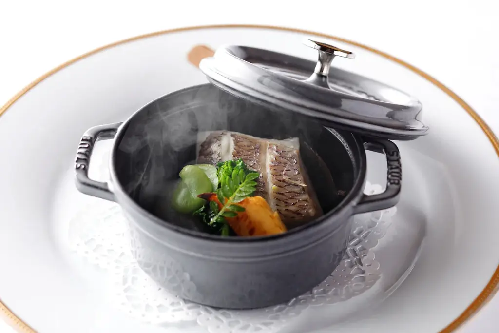 - 魚料理:桜鯛のエチュベ 桜葉香る穏やかな火入れ 春野菜とともに