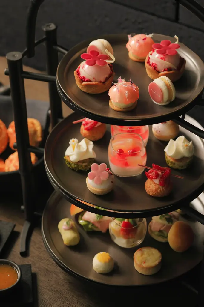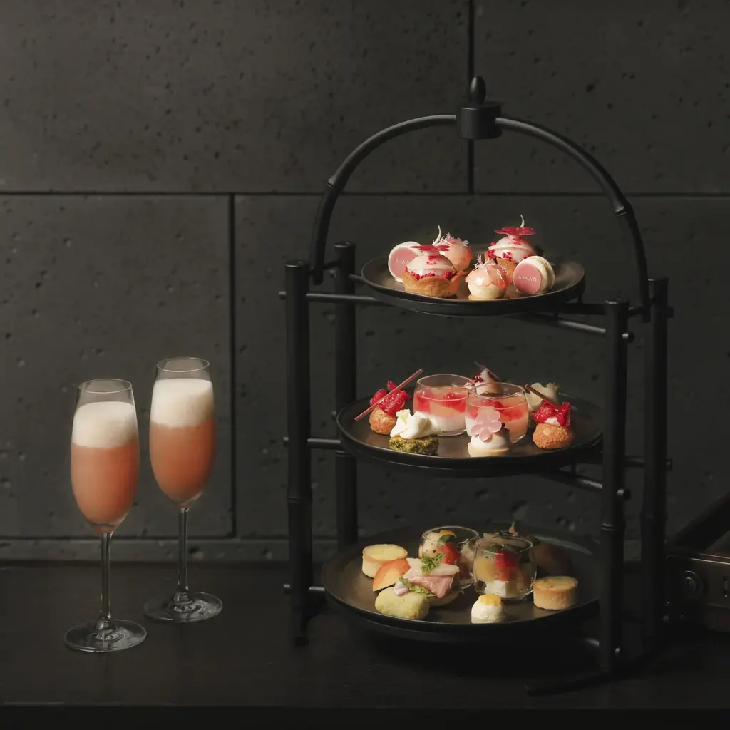 - 下段(セイボリー): オリーブ豚肩のローストと桃のミニバーガー、枝豆のファラフェル