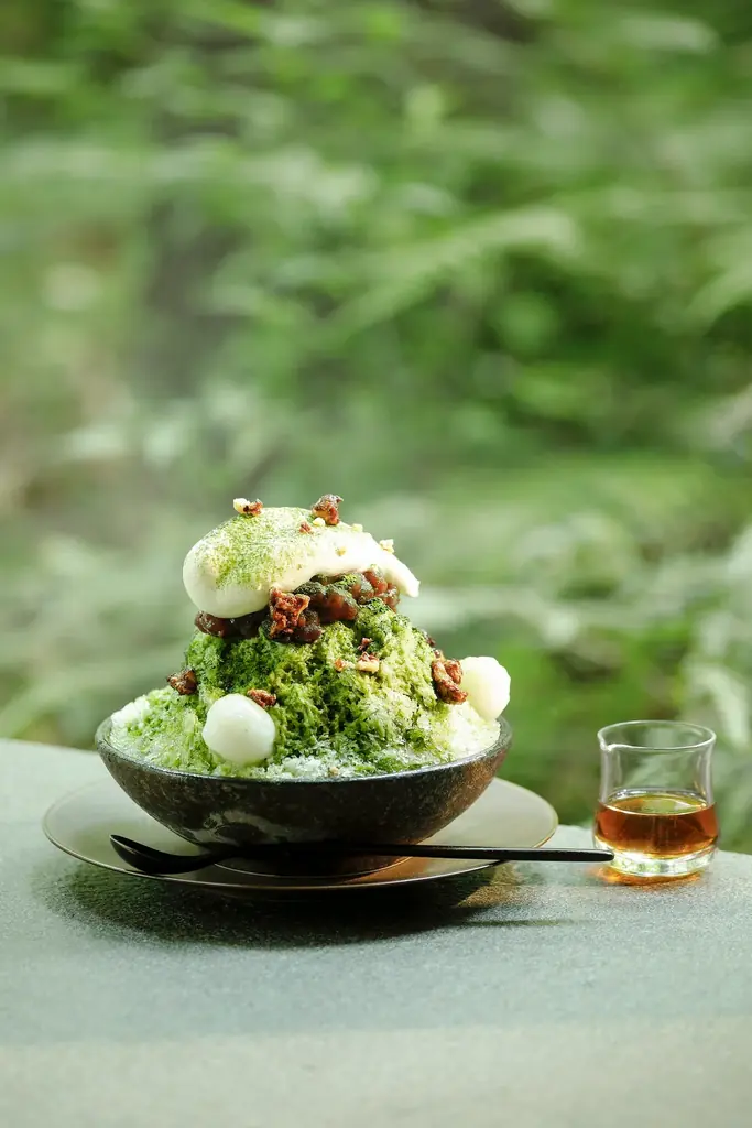 『森のかき氷』は、2種類のフレーバーで提供されます。厳選された抹茶と北海道産の小豆を使用した「抹茶とあずき」には、マスカルポーネのクリームとくるみのキャラメリゼがトッピングされています。一方、「桃とシャンパーニュ」にはシャンパーニュソースとマスカルポーネのクリームが使用されています。料金は各3,415円(税・サービス料込み)で、提供時間は13時から16時までです。