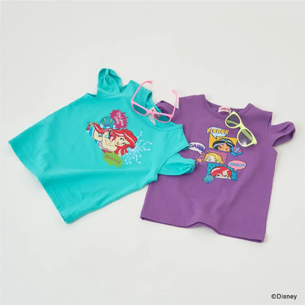 肩開きデザインにリボンのついたスリーブが特徴で、軽快な印象を与えます。ジャスミンやラプンツェルのコミック風グラフィックが施され、アリエルのPOPなデザインがインパクトを与えています。