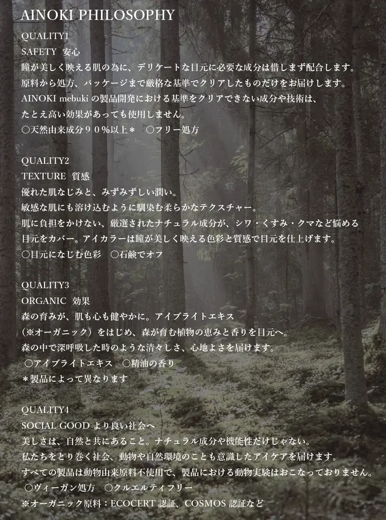「AINOKI」というブランド名には特別な想いが込められています。「AI」は、英語の「eye」と「I」、さらに日本語で「愛(AI)」を表し、「KI」は日本語の「木(KI)」や「気持ち(KIMOCHI)」の頭文字です。このように、目元から一人ひとりが美しく輝くことを願い、個々の「きれいになりたい」という気持ちに寄り添うことを目指しています。