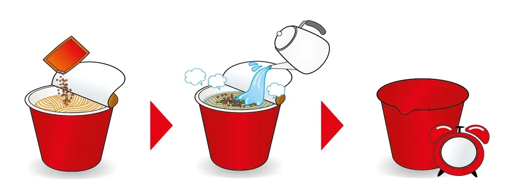 • フタをすべてはがし、麺の上に粉末スープを入れます。