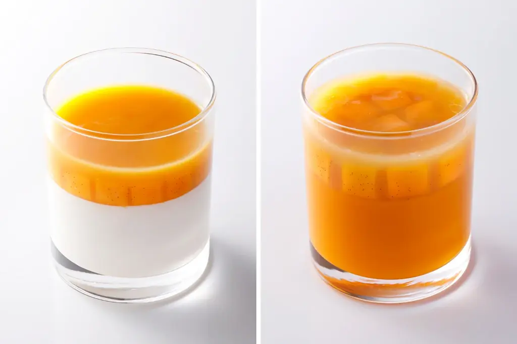 - マンゴーゼリー: フレッシュなパッションフルーツピューレが入ったマンゴーゼリーに、甘みのあるマンゴーを凝縮した葛をまとわせています。
