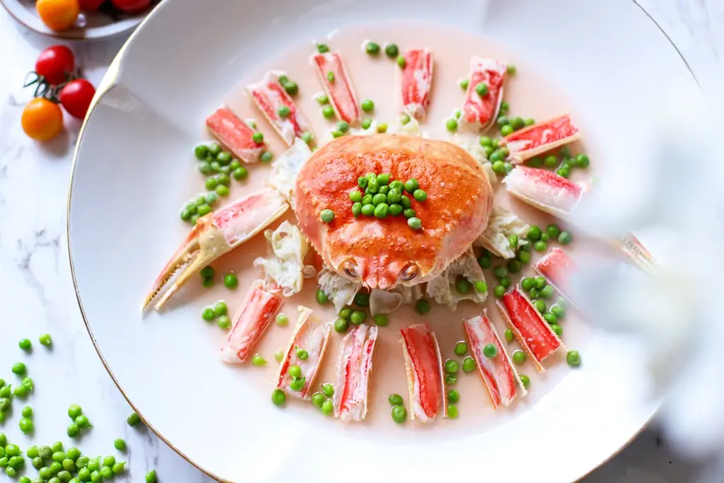 蒸し上げた蟹肉と蟹味噌を重ね、透明な澄ましスープを注いだ爽やかな一皿。