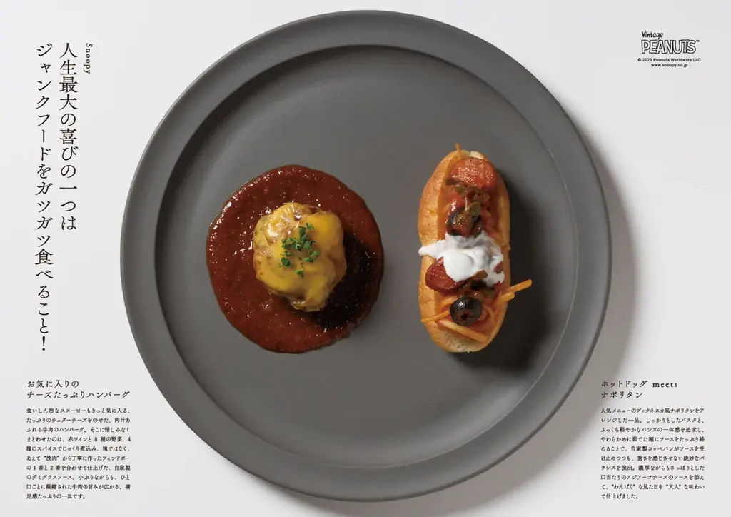 さらに、地下3階に位置するカジュアルダイニング「1/2 (Nibun no Ichi)」では、本イベントに合わせたPEANUTSとのコラボメニューが期間限定で提供されます。チャーリー・ブラウンやスヌーピーたちのキャラクターや言葉からインスパイアされた全6種のメニュープレートが用意され、料理だけでなく、プレイスマットやオリジナルデザインのメニューブックにも注目が集まります。