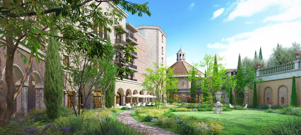 このホテルは、ロマネスク様式を意識したデザインで、古城のような佇まいを持ち、時を重ねることでより美しさを増すことを目指しています。シンボリックなレセプション棟を中心に、北棟・南棟がそれぞれ特徴のあるガーデンに囲まれ、イタリア中世の山岳都市をイメージした都市景観を表現しています。