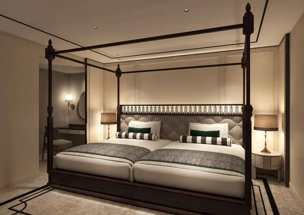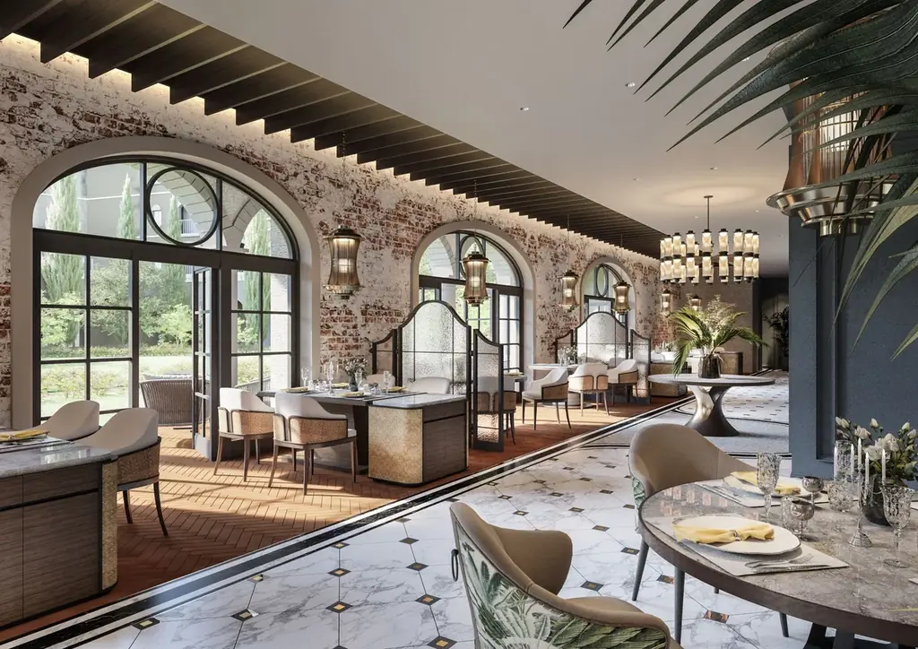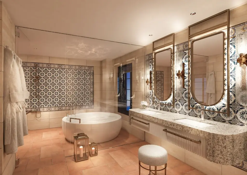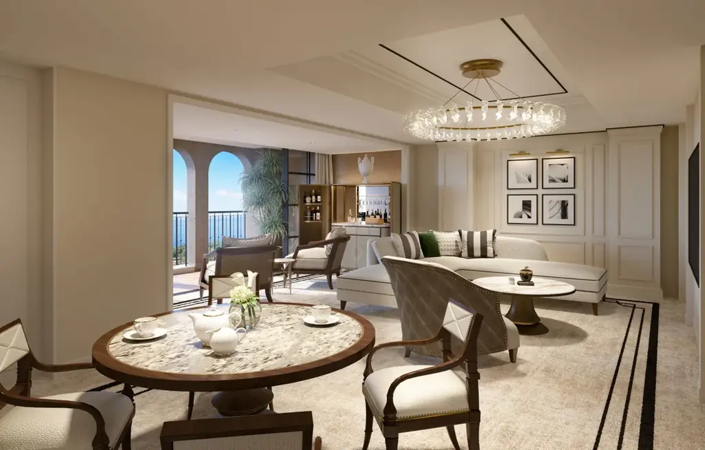 客室は「ロイヤルスイート」「ラグジュアリースイート」「クラブスイート」の3タイプが用意されており、温かみのあるモノトーンを基調にしたデザインと、落ち着いたダークグリーンが取り入れられています。これにより、中世イタリアの古城を彷彿とさせる贅沢な空間が演出されています。