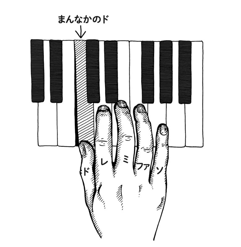 • まんなかのド:ピアノの鍵盤の中心に位置する「まんなかのド」を起点として、初心者が自分の位置を確認するための最適な場所として紹介されています。