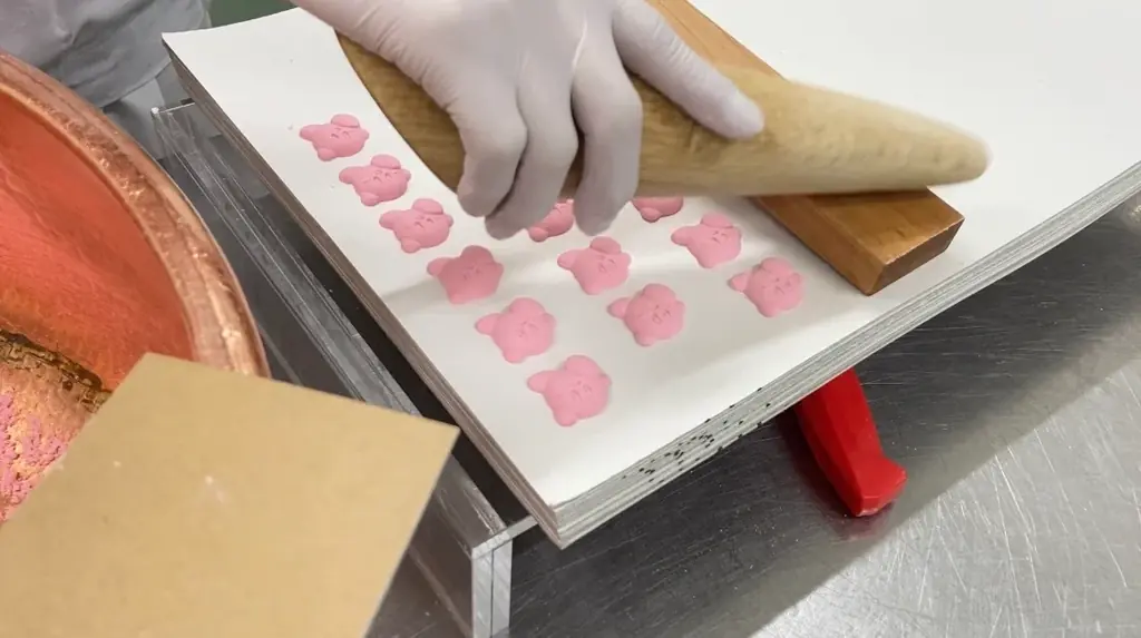落雁は和三盆糖を使用しており、繊細な甘さが楽しめます。特に、本商品に含まれる「カービィ」「夢の泉」「水」は、和三盆糖入りの落雁で、職人が手作業で型に詰めて作り上げています。これにより、見た目も美しく、味わいも上品です。