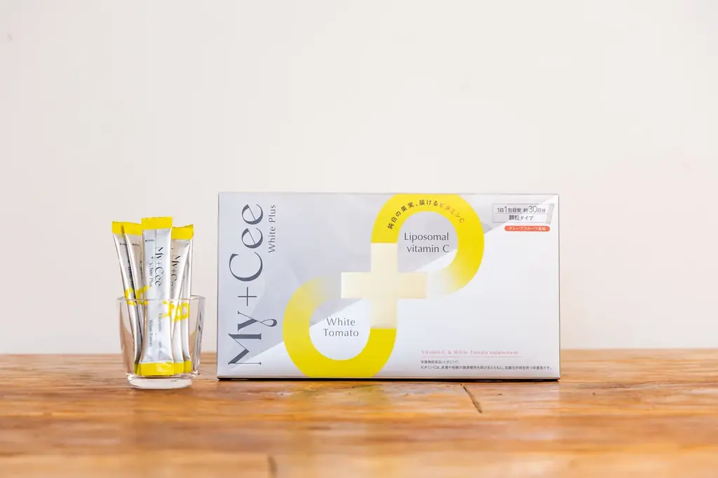 「My+Cee WHITE PLUS」は、SNSで「飲む白玉注射」として話題を集めた美容サプリメントです。この商品は、ホワイトトマト由来の無色カロテノイドとリポソーム化ビタミンCを含み、ビタミンB1、B2、B6、ザクロエキス、ブドウ種子エキス、メロン胎座エキス、パイナップル果実エキスなどの成分が含まれています。顆粒タイプで水なしで摂取可能なため、手軽に美容成分を取り入れることができます。