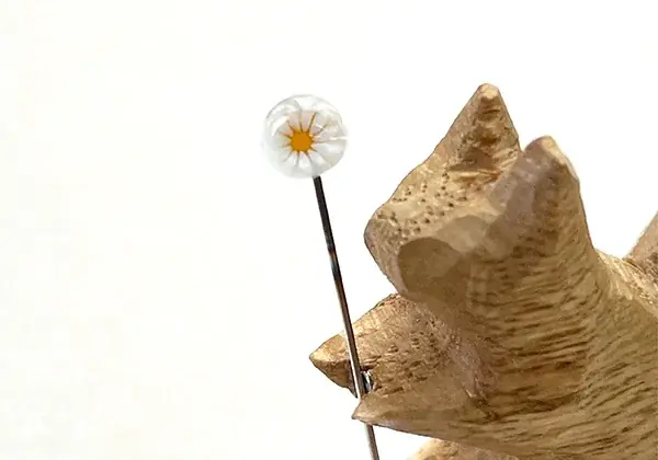 とんぼ玉の待針は、可憐なカモミールを選びました。カモミールの花言葉には「逆境に耐える」「逆境で生まれる力」などがあり、裁縫の時間にリラックスと癒しをもたらす存在です。