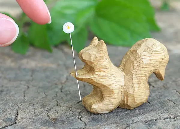「針持ちコリス」は、木彫りのリスの形をした針やすめで、Cohanaの「Co」とリスを組み合わせた名前が付けられています。リスが両手で針をしっかりと預かるデザインで、内蔵された2つのマグネットにより、針をしっかりキャッチします。缶の上で自立することもでき、針拾いにも便利です。