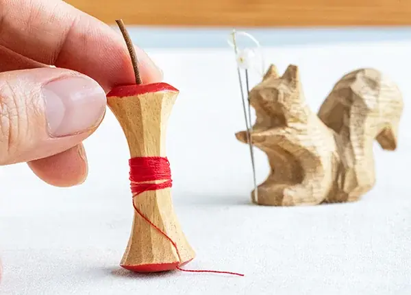 この糸巻きは、リアルな見た目にこだわりつつ、転がりにくい工夫が施されています。コリスと同じ木彫り職人によって作られ、セット全体の可愛らしい世界観を演出します。