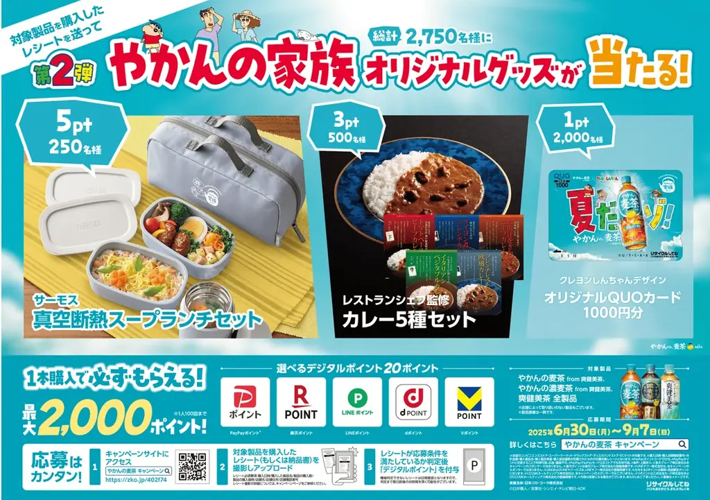 キャンペーンでは、対象製品を購入し、レシートを撮影してアップロードすることで、選べるデジタルポイントが最大2,000ポイントもらえます。さらに、3本または5本購入すると、「やかんの家族」オリジナルのグルメ関連グッズが当たるチャンスもあります。キャンペーンの詳細は公式サイトで確認できます。
