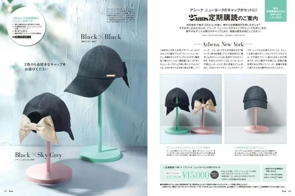 『25ans』の定期購読を利用することで、毎月送料無料で雑誌が届くほか、特別なプレゼントや特典も用意されています。現在申し込むと、「アシーナ ニューヨーク」のリボンキャップがセットで付いてくる特典もあり、非常に魅力的です。