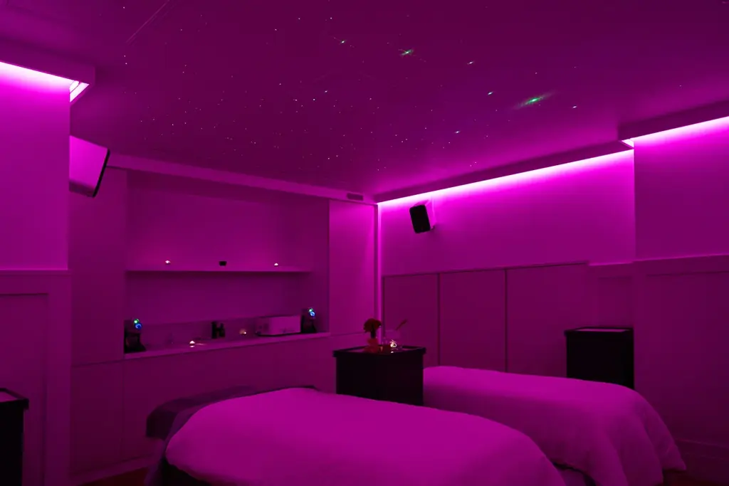 トリートメントルームでは、最新の音響と照明が施され、全身でラッシュオリジナルの音楽を感じることができます。ウーファーがベッドの下に配置されており、映画館のような臨場感を体験することが可能です。また、光の演出により、全身が包み込まれるような感覚を楽しむことができ、五感が研ぎ澄まされる没入感を提供します。