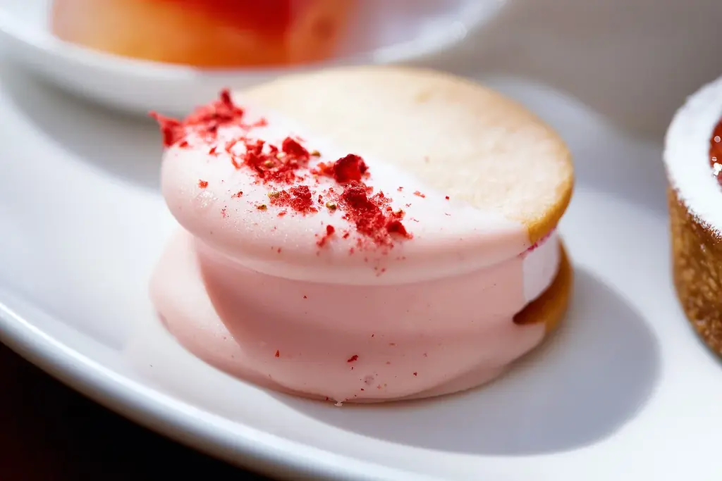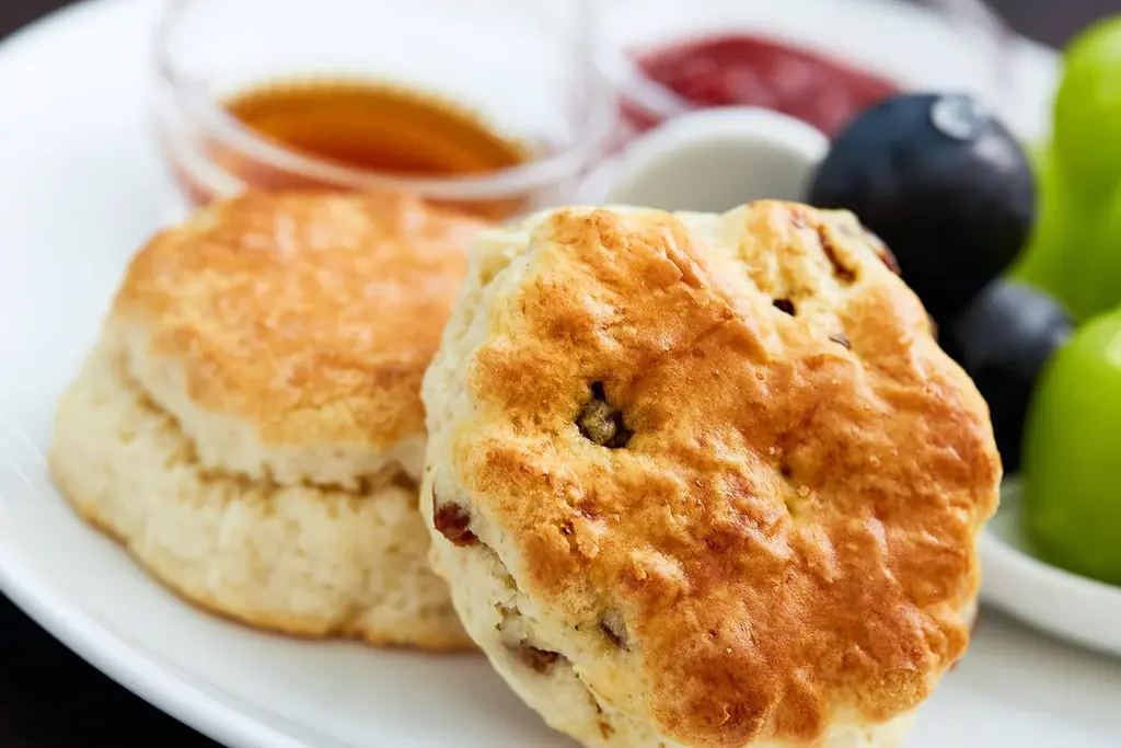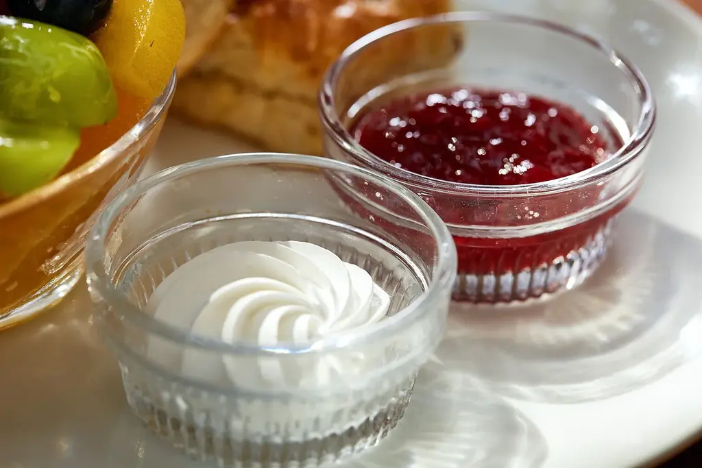 - 本格イギリススコーン2種: しっとりとした食感のスコーン、特製苺ジャムとクリームチーズの付け合わせ付き。
