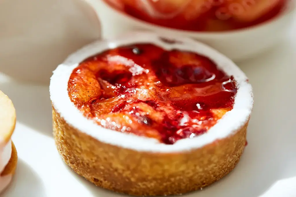- ミラベルの焼きタルト: 西洋プラムのミラベルをフランボワーズと共にじっくり焼き上げたタルト。