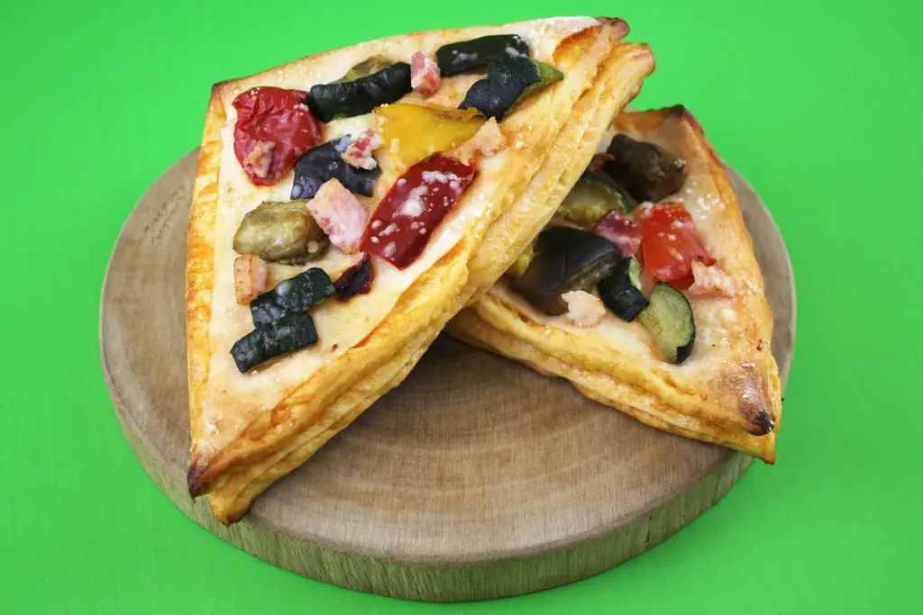 トマトとニンニクのフィリングを折り込んだ生地に、ハーブで味付けしたグリル野菜をトッピングして焼き上げました。グリル野菜のゴロっとした歯ごたえと、ニンニク香るピザ生地が食欲をそそります。