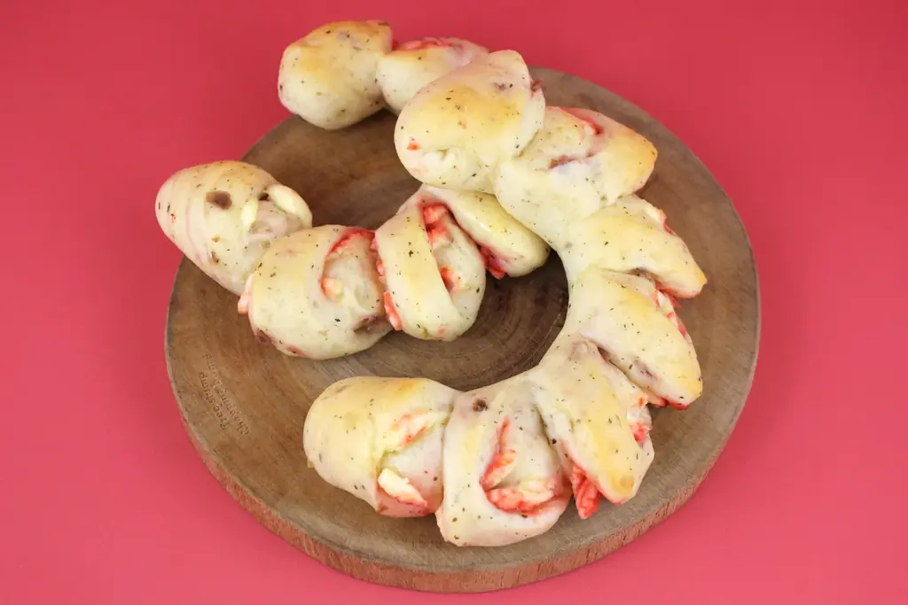 赤しそふりかけとカリカリ梅を練り込んだ生地に、梅肉とカマンベール風味のチーズクリームを包み焼き上げた一品です。梅の酸味とチーズの濃厚さが絶妙にマッチし、おつまみとしても楽しめます。