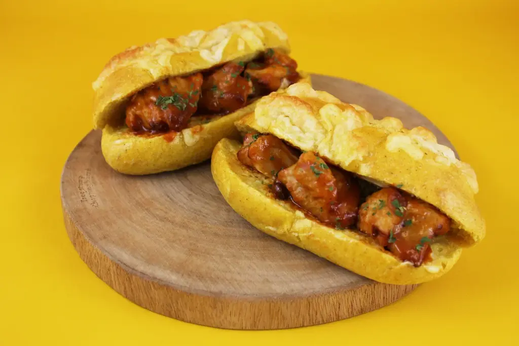 カレー粉を練り込んだ生地に、カレーケチャップを絡めたチキンをサンドしました。スパイシーなカレーと柔らかくジューシーなチキンの組み合わせは、食欲をそそる一品です。