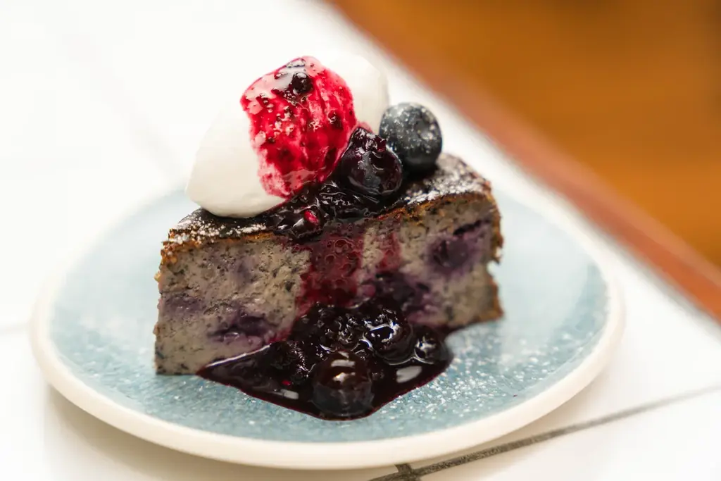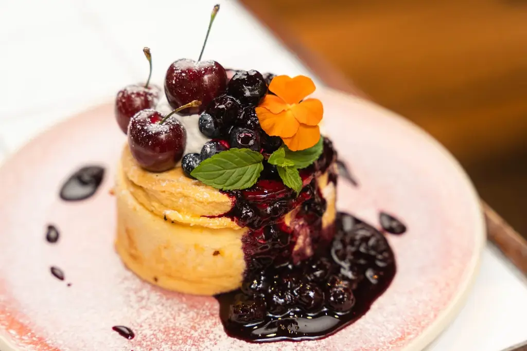 このパンケーキは、他にはない極上の体験を提供します。アメリカンチェリーとブルーベリーのトッピングにより、見た目も華やかで、インスタ映え間違いなしの一品です。果実の甘みを引き立てる自家製チーズソースとの相性も抜群です。