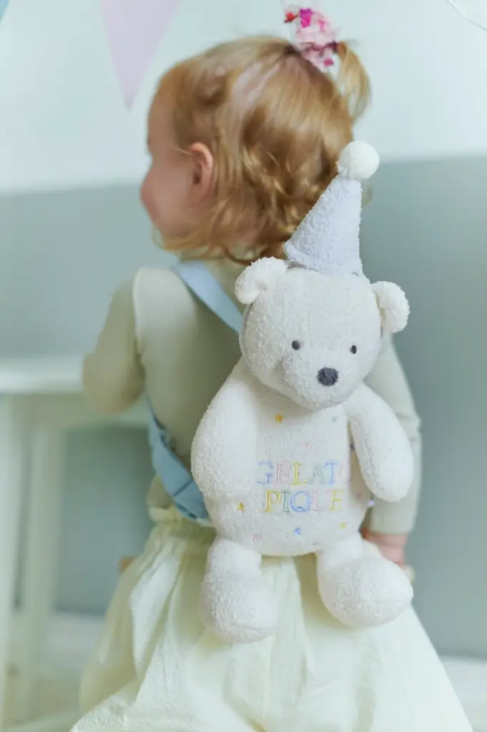特長:バースデーハットをかぶったベアモチーフのリュック。肩紐は取り外し可能で、ぬいぐるみとしても活用できます。 - エアリーモコアニバーサリーベアラトル