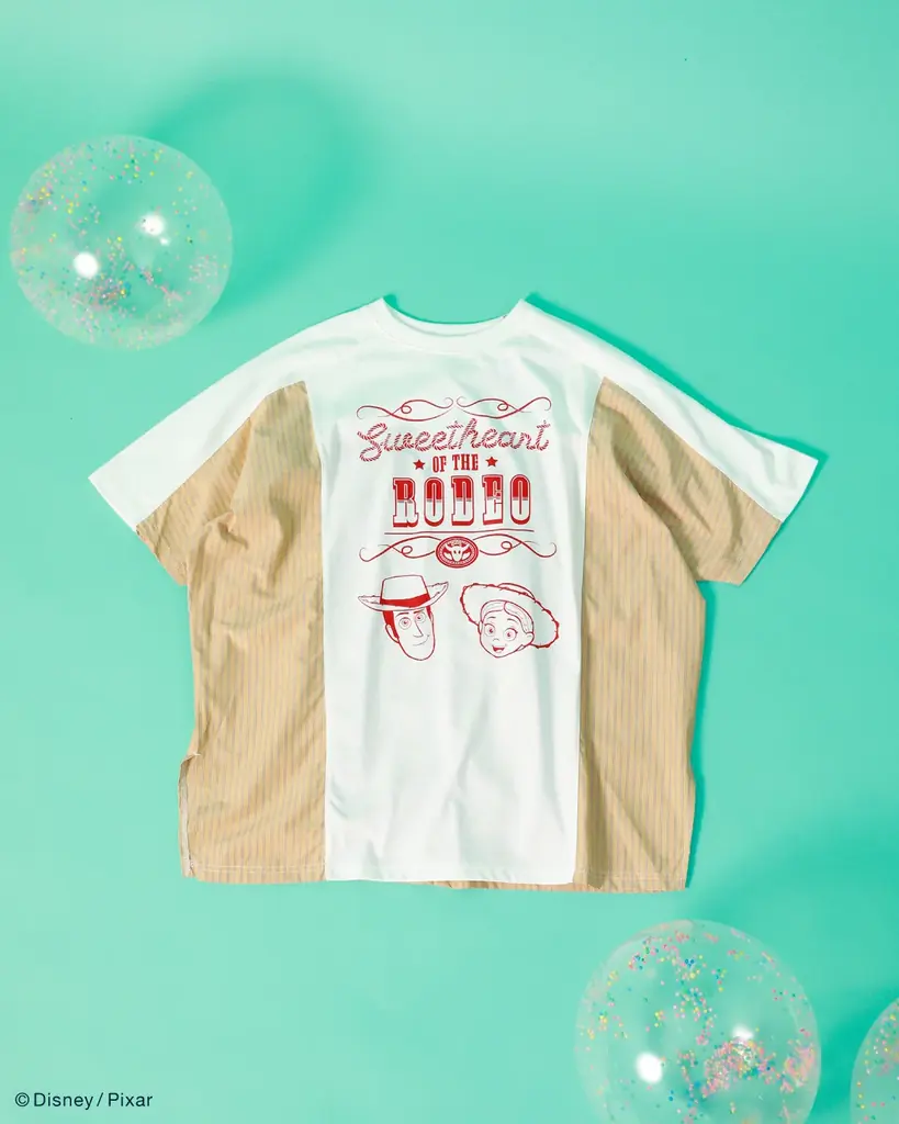映画の人気キャラクターがデザインされたアニバーサリープルオーバーやウエスタン調のチュニック、恐竜レックスのTシャツ、ジェシーのフリンジバッグなど全6型が登場します。