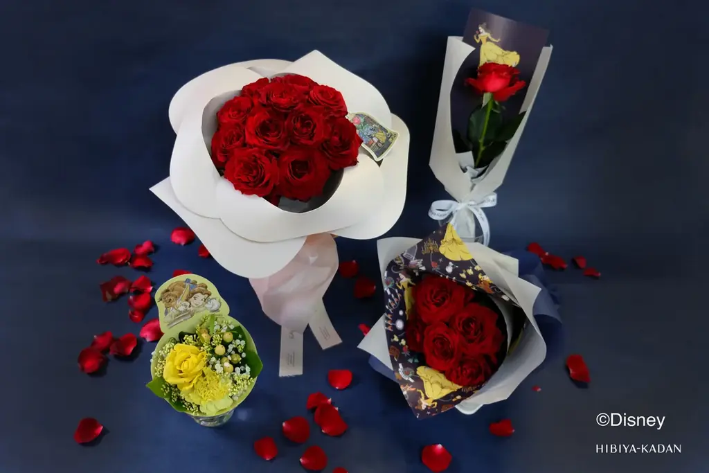 期間中、日比谷花壇の銀座松屋店とHibiya-Kadan Style アトレ恵比寿店では、真紅のバラをはじめとした物語のロマンチックな雰囲気をまとった美しい花々で店内を特別に装飾します。この装飾は、訪れる人々に『美女と野獣』の世界観を感じさせる特別な体験を提供します。