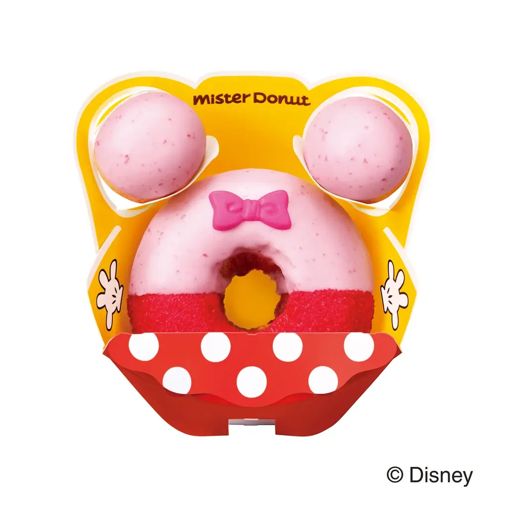 キャラメルフレーバーのふわふわシュードーナツ生地にストロベリーチョコをコーティングし、りんごシュガーでミニーマウスのイメージカラーを再現。ポン・デ・ストロベリーボールとピンクのリボンをトッピングした可愛らしいデザインです。