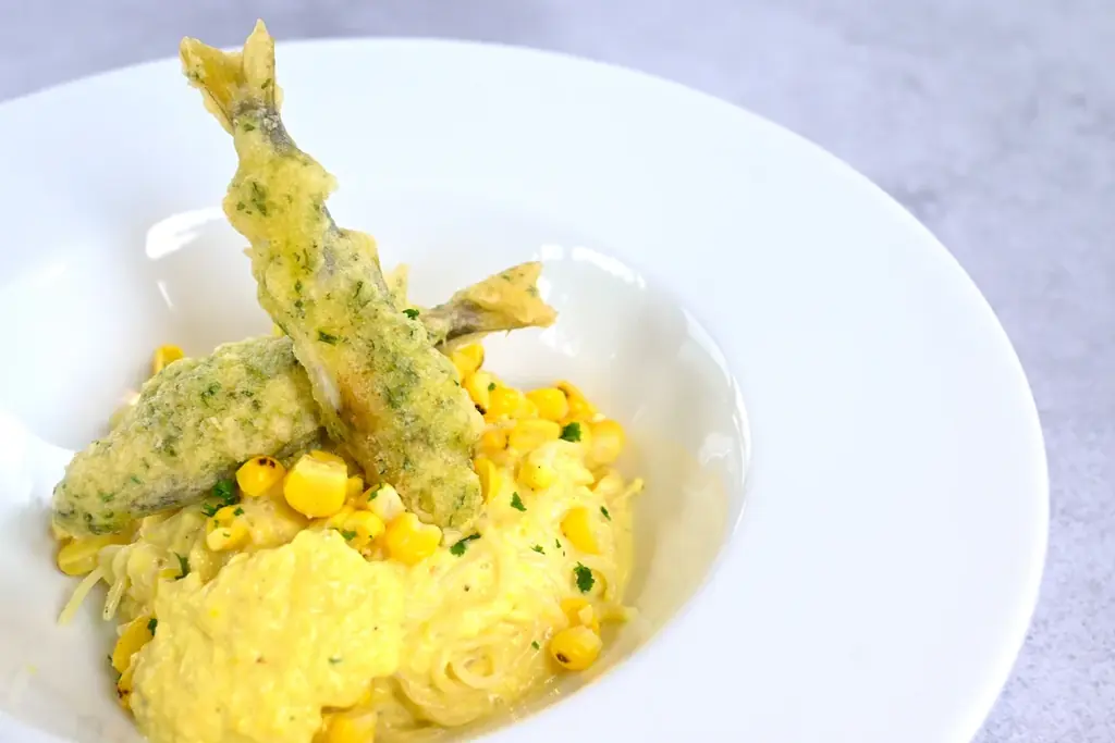 パスタ 焼きもろこしのカッペリーニ 稚鮎のフリット