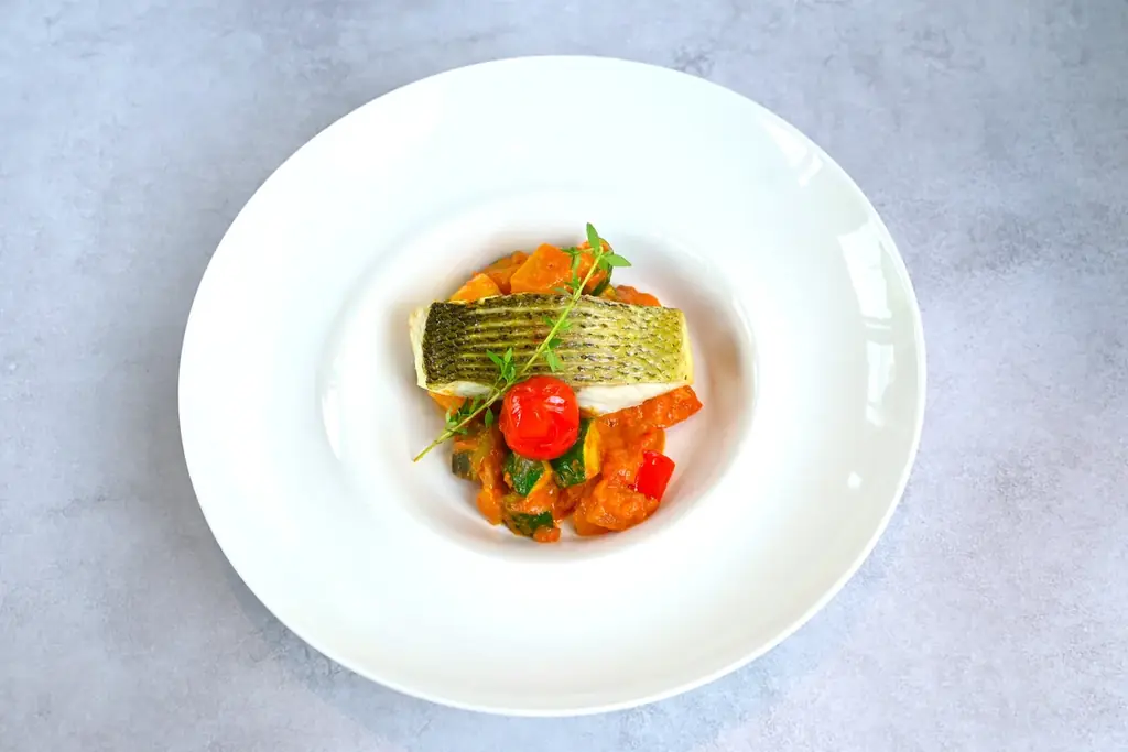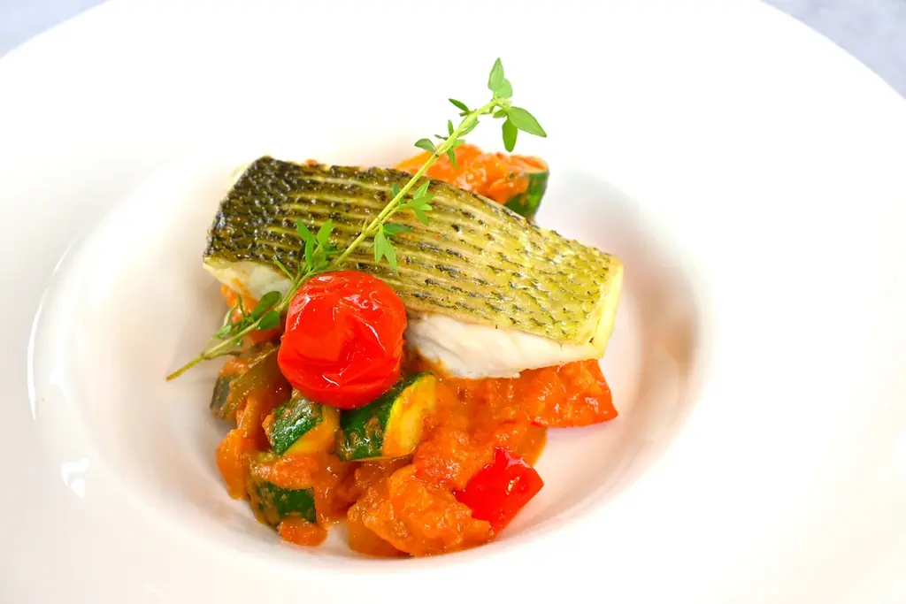 お魚料理 鱸のポアレ 山椒の香り 〜ラタトゥイユソース〜