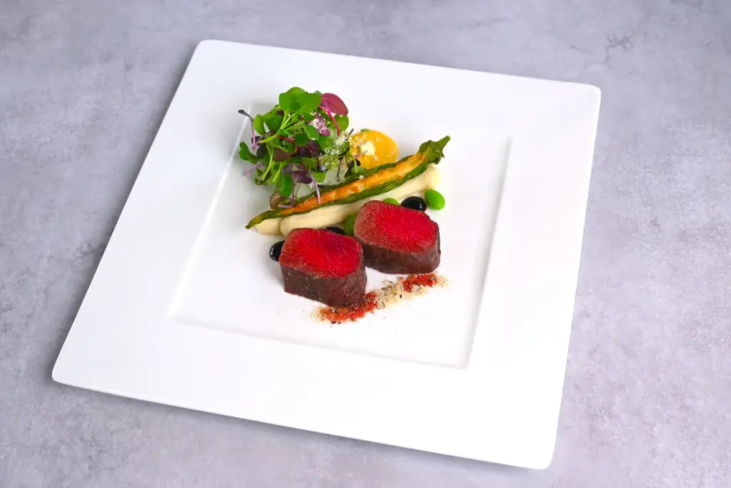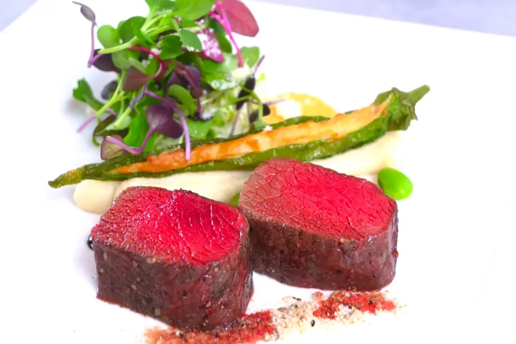 メイン(お肉料理) 鹿肉のロースト 〜ジャポネソース〜 岩塩、山葵 甘長唐辛子の海老真丈添え