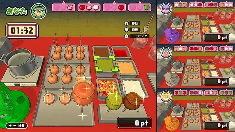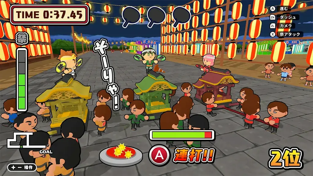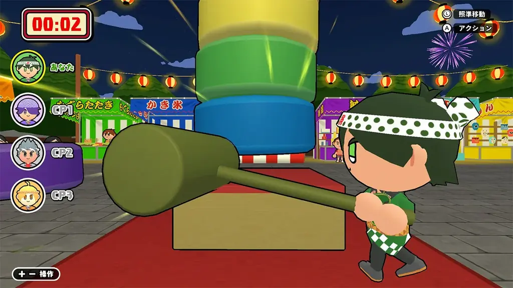 夏祭りをテーマにしたアクションパーティゲームで、ヨーヨー釣りや射的など多彩なミニゲームが楽しめ、最大4人で遊べます。