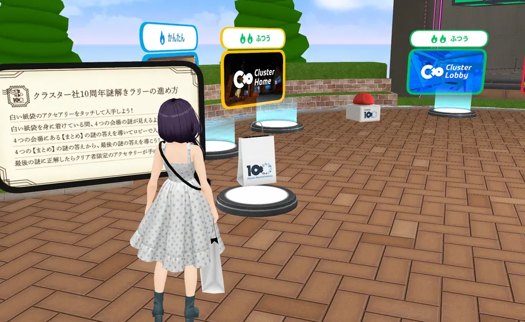 本イベントでは、参加者が「clusterロビー空間」にログインし、特別な紙袋を受け取ることから始まります。この紙袋には、謎解きに必要な特別な仕掛けが含まれており、正解を導き出すことで「特別な10周年記念紙袋」を入手することができます。
