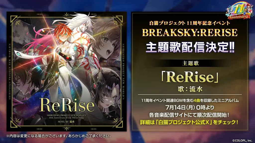 株式会社コロプラが提供するスマートフォン向け本格3DアクションRPG『白猫プロジェクト NEW WORLD’S(以下、『白猫』)』は、2025年7月14日(月)にサービス開始11周年を迎えました。この特別な節目を祝うために、メインストーリーの新章「神域のフロンティア編 第8章 BREAKSKY:RERISE」が開幕しました。これに伴い、様々なイベントやキャンペーンが展開される予定です。