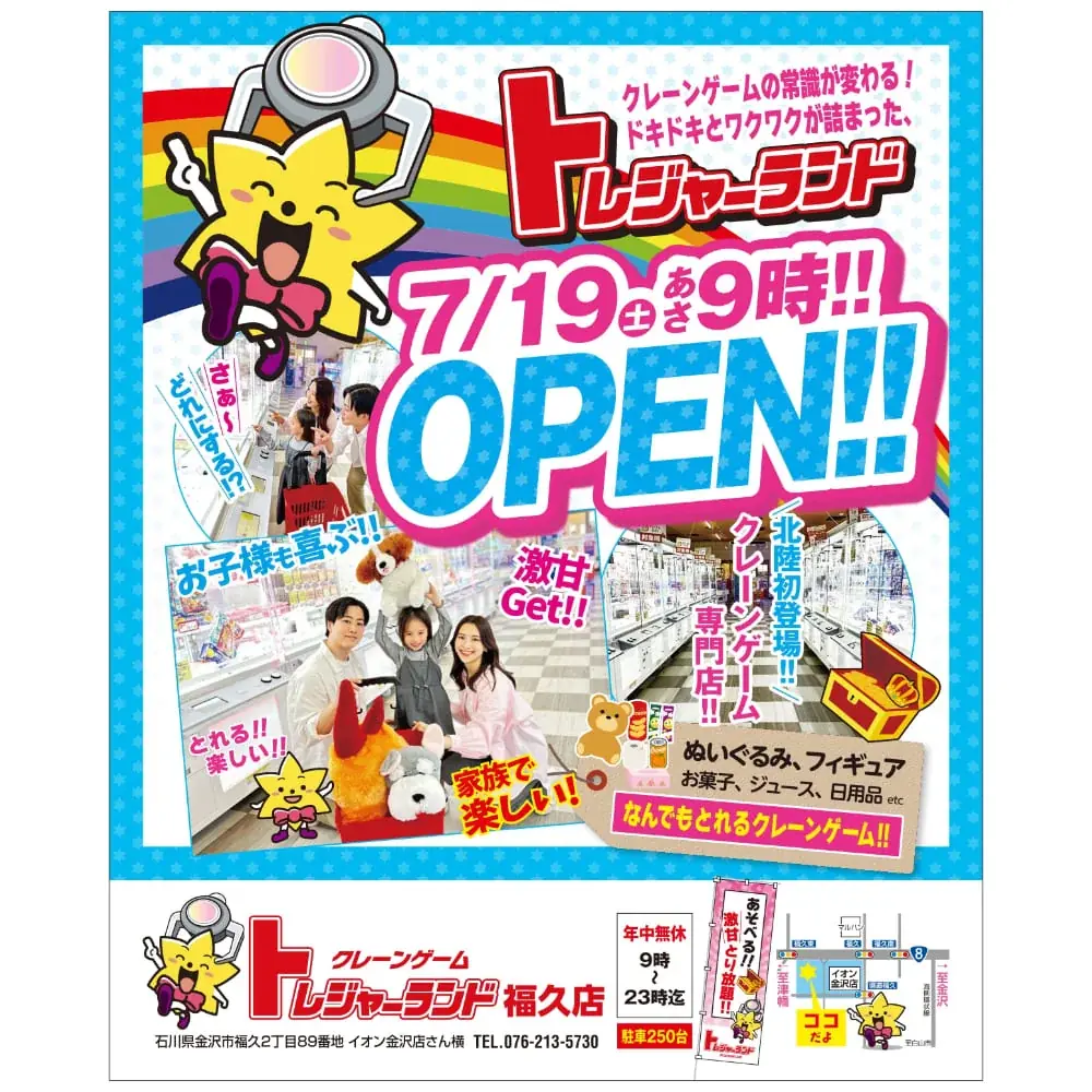 2025年7月19日開店!金沢の新クレーンゲーム専門店トレジャーランド福久店