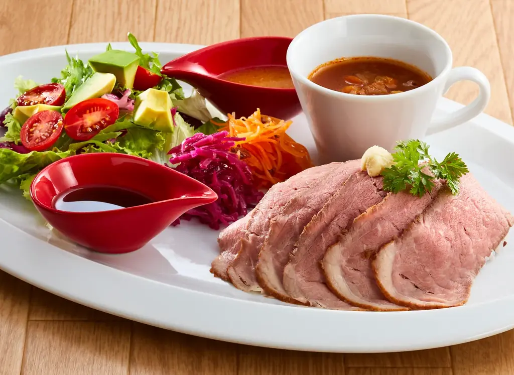 柔らかいローストビーフと彩り豊かなサラダを添えた一皿。