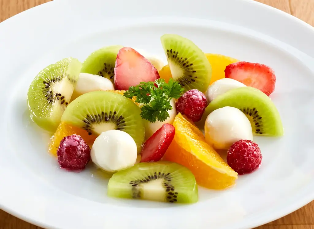 色鮮やかないちご、オレンジ、キウイ、バナナなどを盛り付け、フランボワーズソースをかけた贅沢な一品。